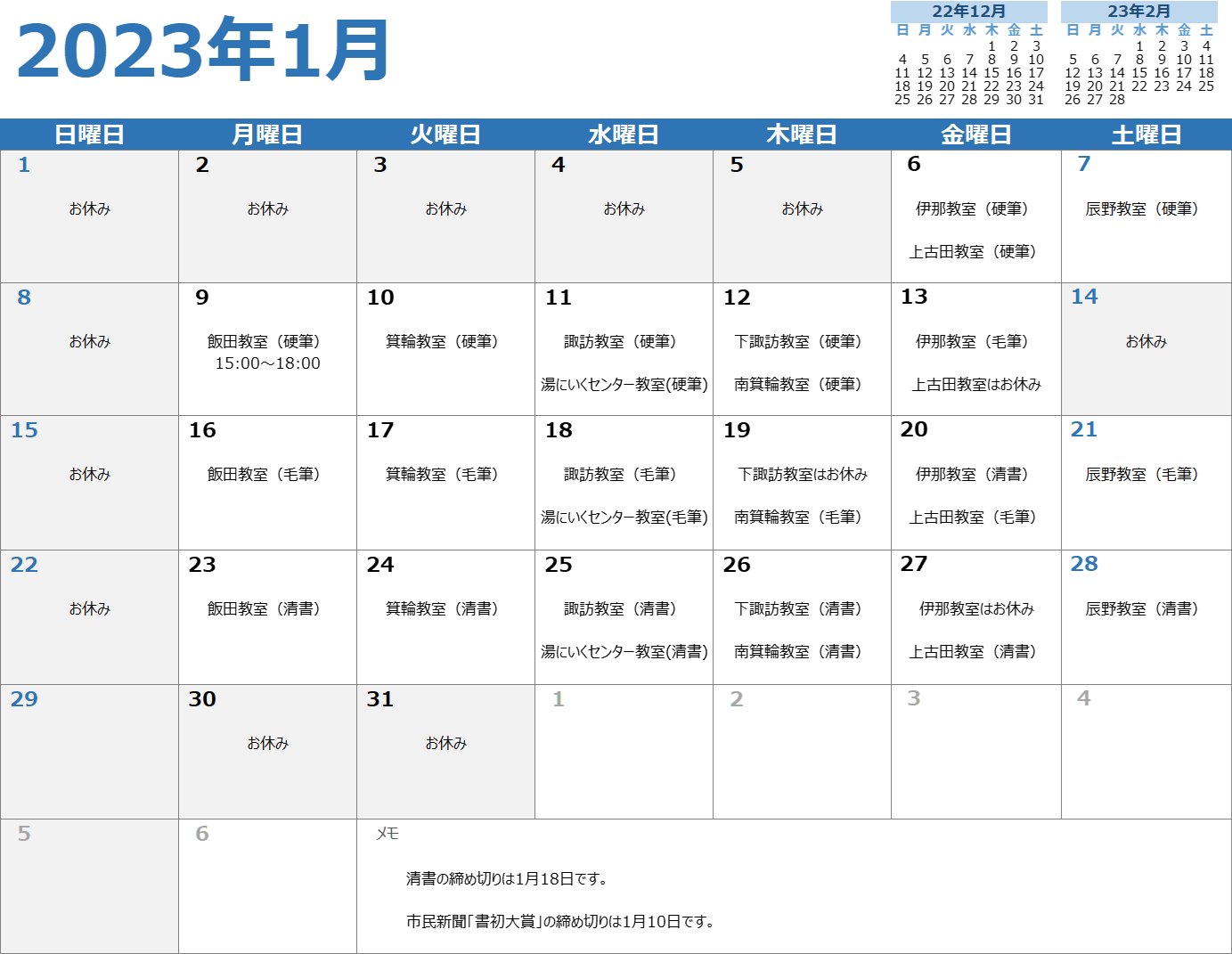 1月お稽古カレンダー