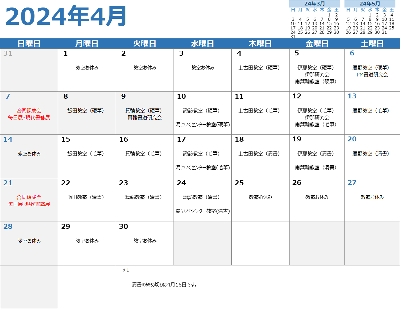 4月お稽古カレンダー