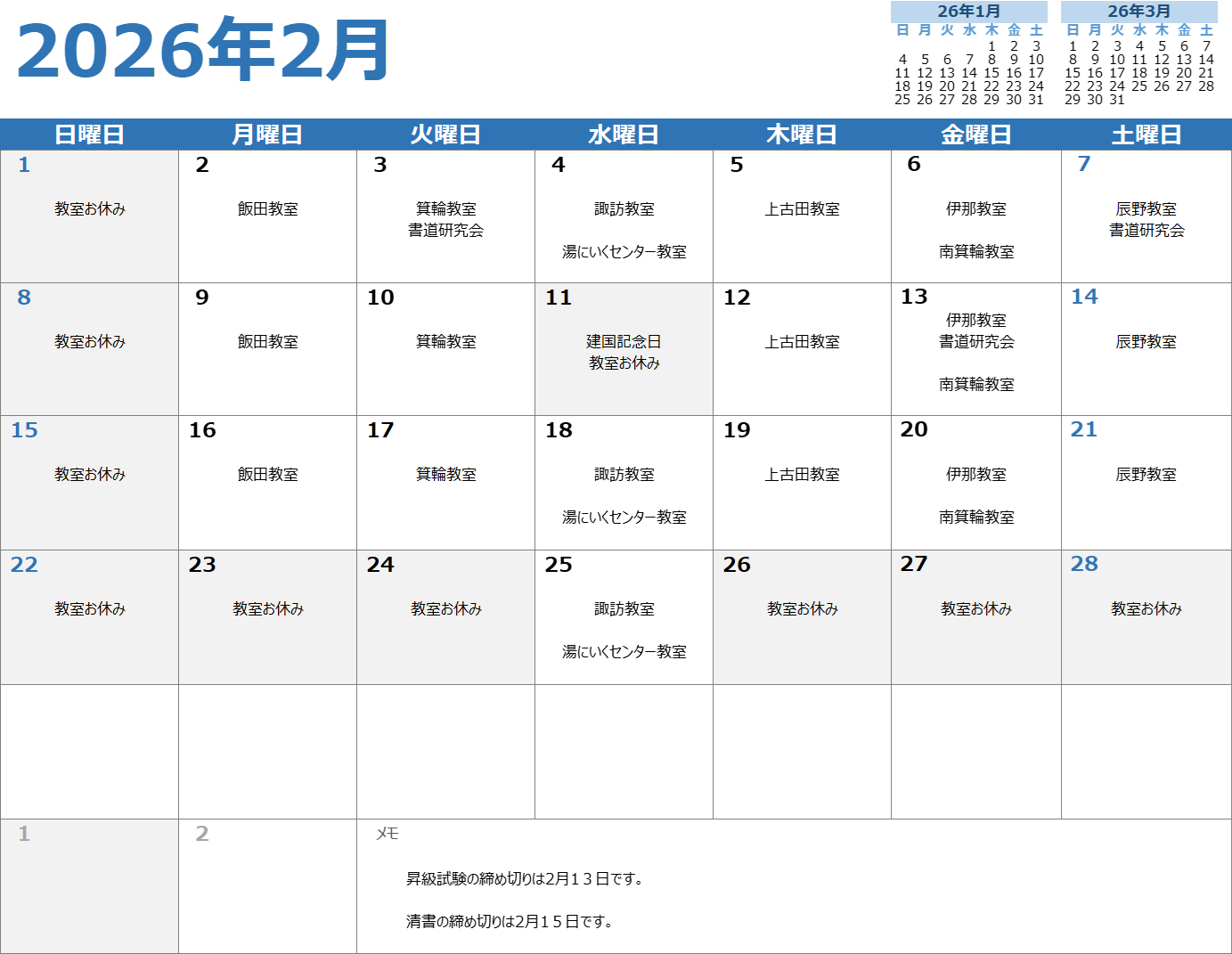2026年2月お稽古カレンダー